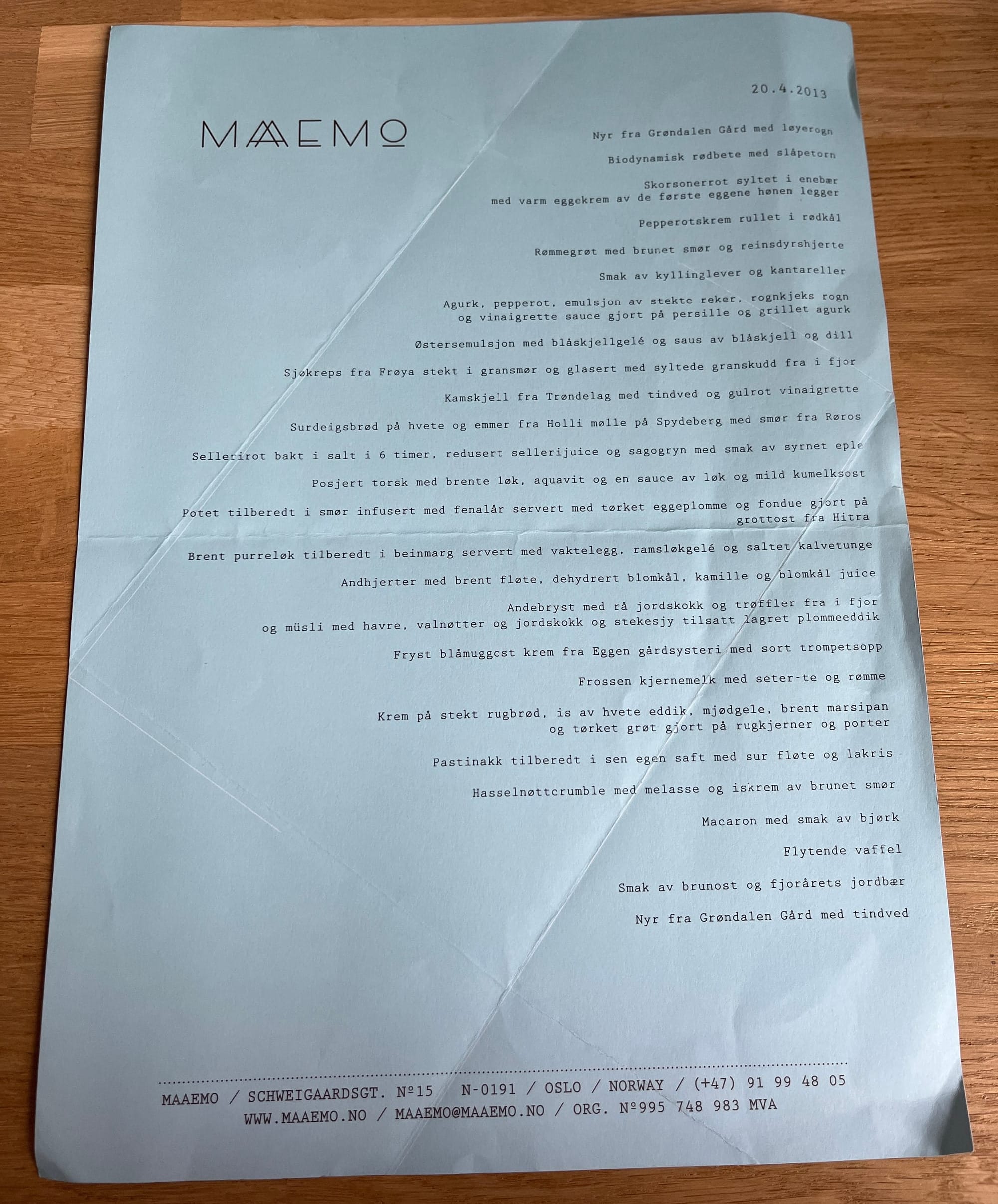På menyen stod ikke bare den nå legendariske rømmegrøten, men også det som i menyen ble omtalt som en «müsli», som i realiteten var en grovkornet grøt, servert med noen skiver andekjøtt. Helt fram til 1960-tallet var slik vassgraut med sul (en fellesbetegnelse for konservert kjøtt eller fisk servert sammen med grøten) hverdagskost i regionen jeg kommer fra, Salten. I en annen og sikkert ikke like sofistiskert form, selvsagt, men likevel gjenkjennelig på en måte som berørte meg i den grad at jeg fortsatt husker det til dags dato selv om jeg ikke var i stand til å formulere det da.