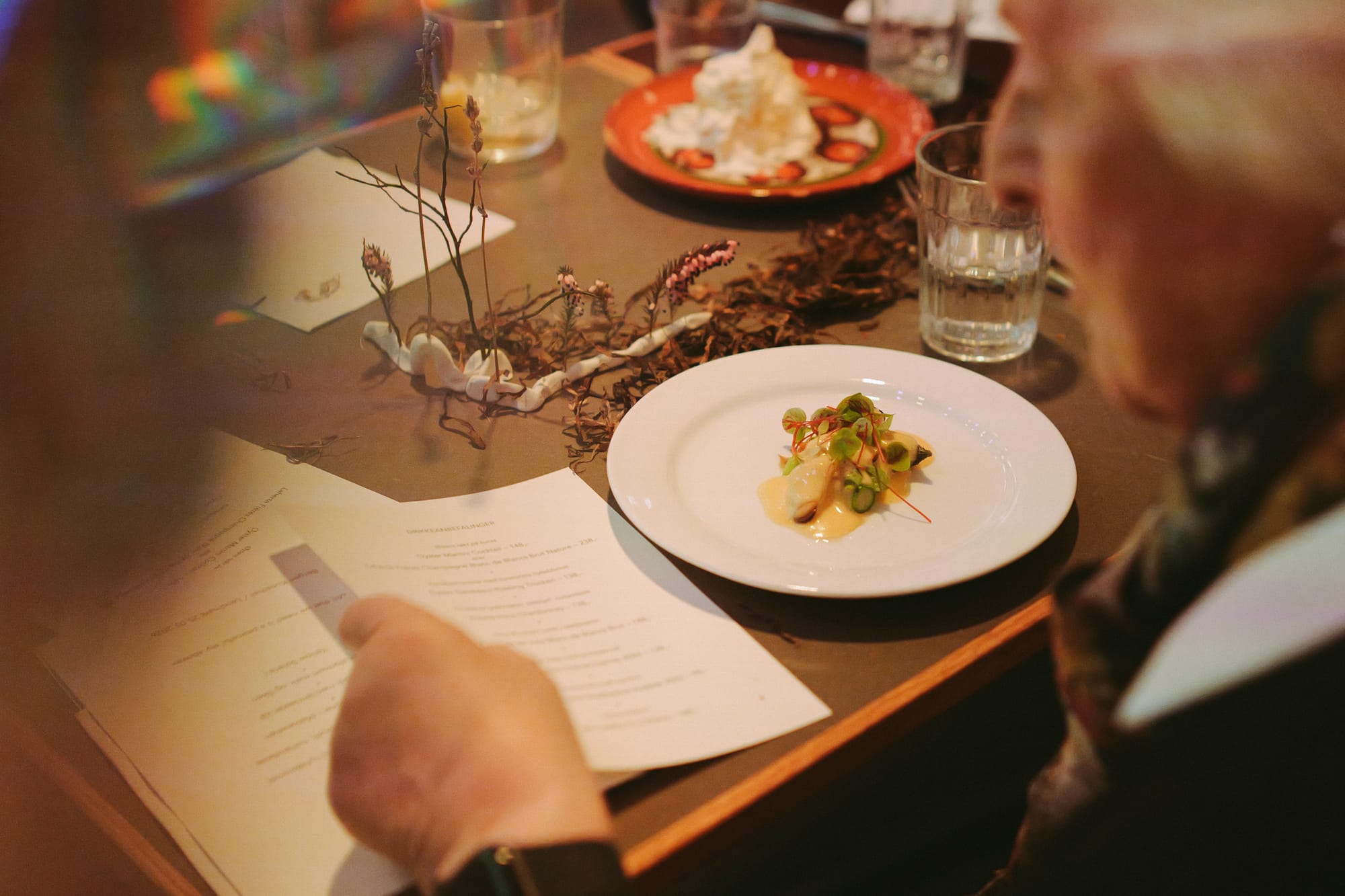 Kveldens beste rett var ifølge flere av gjestene den som tok utgangspunkt i sovjetisk forskning på kålplantenes følelsesliv, så vel som nyere forskning på de fascinerende sammenvevde livene til sopp og planter. Så kom en osteservering med en tête de moine-blomst servert med en fiken som nikket til Ingela Ihrmans poetiske og gøyale fikenperformance som fant sted inne i utstillingen før middagen startet. Desserten var inspirert av Mira Adoumier og Nour Ouaydas film Red Solaris I. Her handler det om koloniale planter i botaniske hager verden rundt, som bærer på minner om forflytning, traumer og tap – i et spekulativt verk med humor og finstemt sårhet.